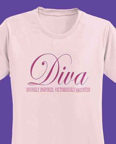DIVA INSPIRATIONAL T-SHIRT- Walk with your God-given identity with confidence and grace. This D.I.V.A. (Divinely Inspired, Victoriously Anointed) T-shirt is more than a fashion statement—it’s a declaration of purpose. Designed for bold, faith-filled women who walk in divine inspiration and carry the anointing of victory, this shirt reminds you (and everyone who sees it) that you are chosen, empowered, and wonderfully set apart.