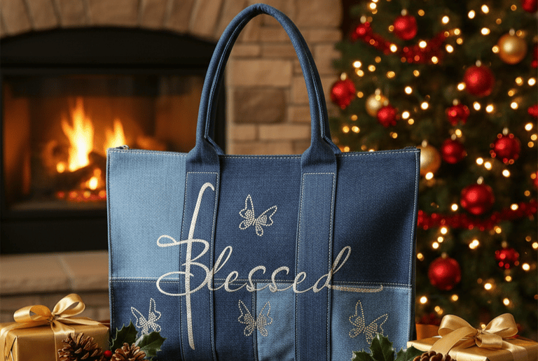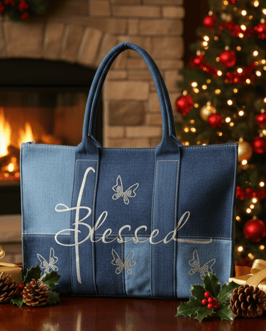 BLESSED AFFIRMATION BAG- Elevate your everyday look with our Blessed Denim Tote Bag—a stunning blend of style and inspiration. Showcasing a unique patchwork denim design in classic blues, this spacious tote is beautifully adorned with the uplifting glitter word 'Blessed' and delicate rhinestone butterflies, symbolizing positivity and transformation.